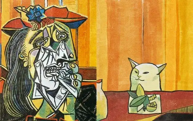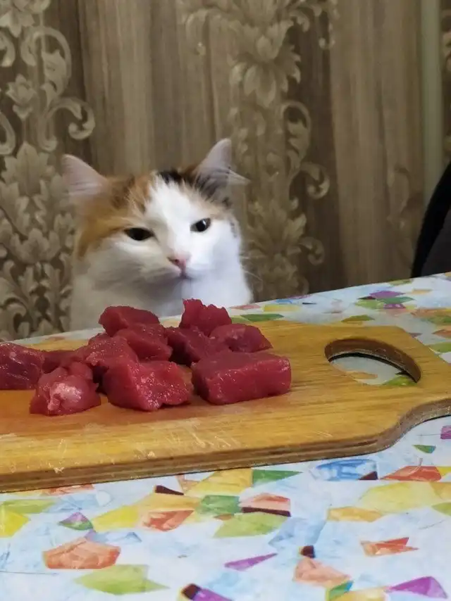 В интернетах распространился мем с сидящим перед тарелкой овощей белым котом, на которого кричат две женщины.