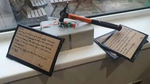 "Мой приятель-сосед уехал в отпуск и я украсил его дом цитатами из песен группы, которую он терпеть не может. Это месть: когда уезжал я, он украсил мой дом фаллоимитаторами и изображениями пенисов"