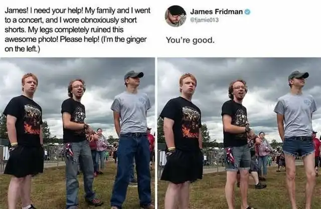 «Джеймс! Мне нужна твоя помощь! Мы с друзьями пошли на концерт, и я надел оскорбительно короткие шорты. Мои ноги полностью изуродовали это классное фото. Пожалуйста, помоги! (Я рыжий парень слева)»
