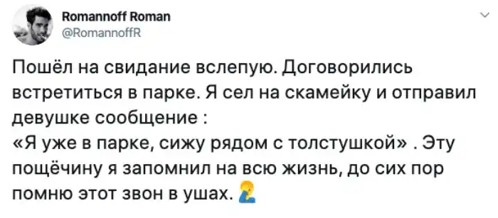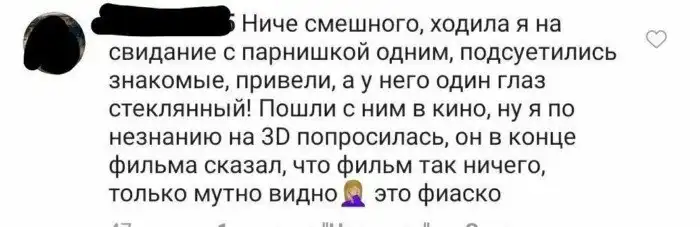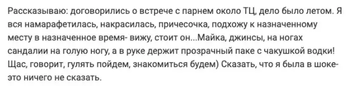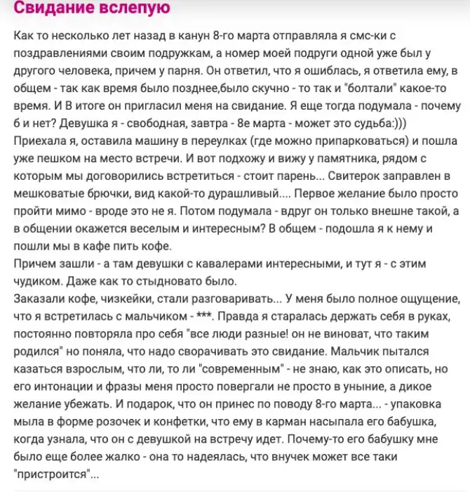 "Пришел в трениках и просил на пиво", "Толстая, а говорила, что худая", "Я думал, ты красивее будешь", - это и многое другое можно услышать от людей, которые сходили на неудачное свидание вслепую. Мы собрали опыт людей, которые познакомились и почти пожалели об этом.