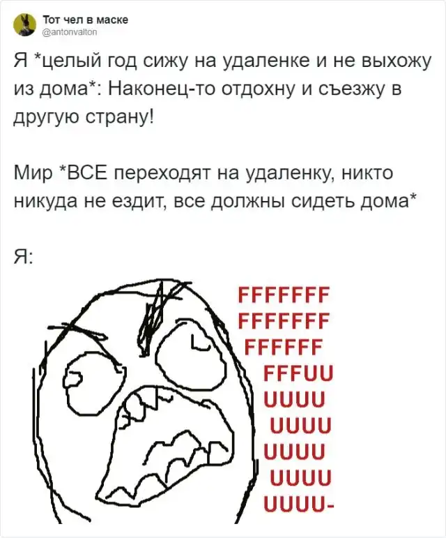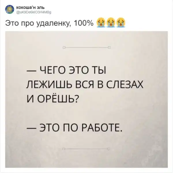 Что поделать, коноравирус - главная тема в мире на данный момент. От новостей о пандемии не скрыться. Юмор также не обходит эту тему стороной. Из-за карантина и угрозы распространения COVID-19 многие сотрудники вынуждены переводиться на удаленную работу. Именно это и стало поводом создать юмористический тред о работе на удаленке в условиях каратнтина.