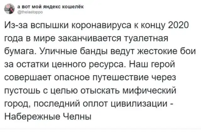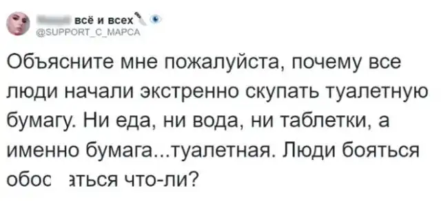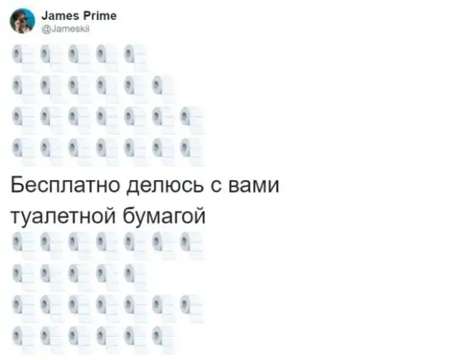 Как вы знаете, ажиотаж вокруг самой обычной туалетной бумаги набирает обороты по всему миру. Люди сметают "ценнейший" ресурс с полок, а многие пользователи в Интернете не понимают подобной паники. И поэтому они решили просто посмеяться над происходящим.