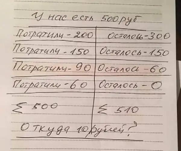 10 рублей осталось от бездумного счёта остатка. Типа потратил 2руб. осталось 498 и т.д.