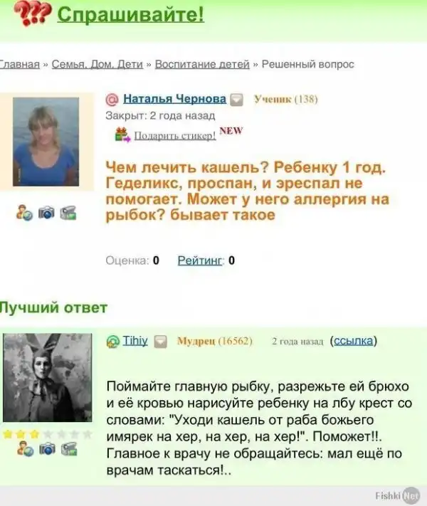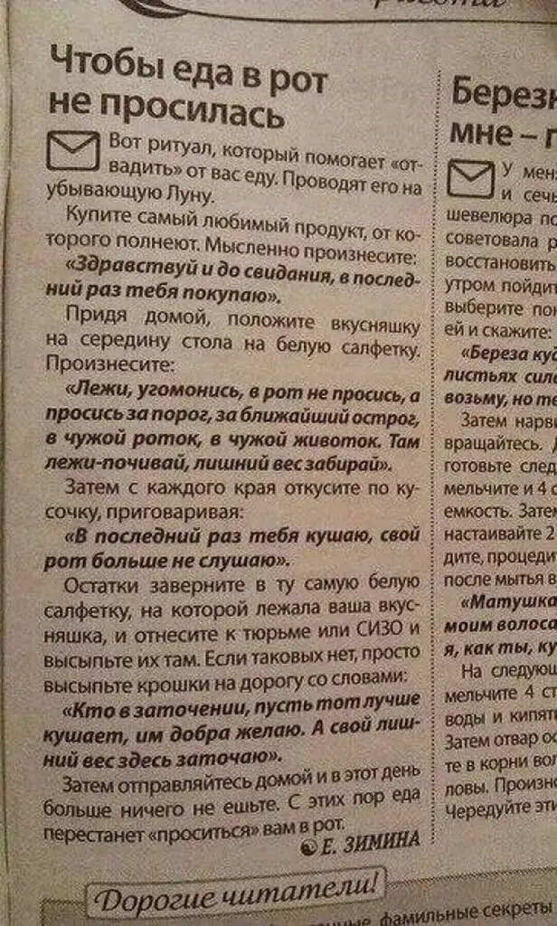 Страшно не то, что это кто-то придумывает, а то, что это публикуют и многие в это верят и настойчиво используют в своей жизни. Молитвы против застрявшей в горле кости, кот против глухоты и стул для нежелательной беременности - это не только невероятная глупость, но и огромная опасность для жизни и здоровья. Жаль, что вокруг так много дремучих людей...