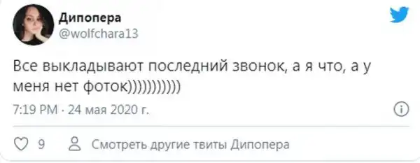 Из-за пандемии коронавируса школьники были лишены нормального последнего звонка. С одной стороны, на улицах будет меньше "пьяных бантиков", с другой - все равно обидно, поскольку это довольно важный день. И в социальных сетях школьники начали делиться своими мыслями по этому поводу и фотографиями происходящего.