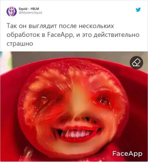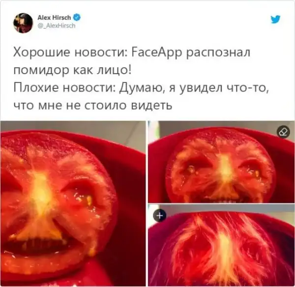Мобильные приложения часто могут ошибаться и из этого получаются смешные картинки – например, FaceApp определил разрезанный помидор как лицо, и это не осталось в стороне от пользователей.