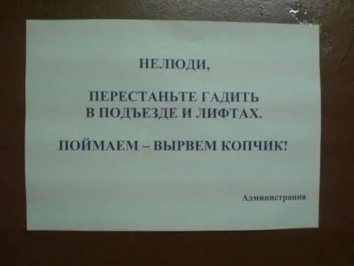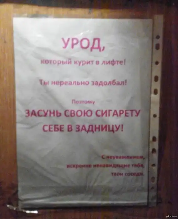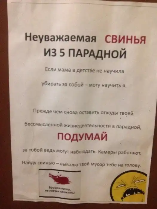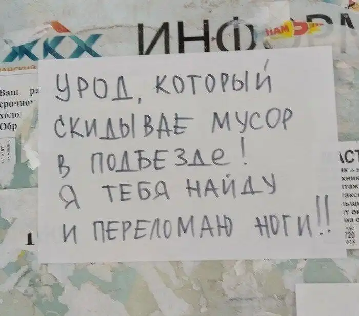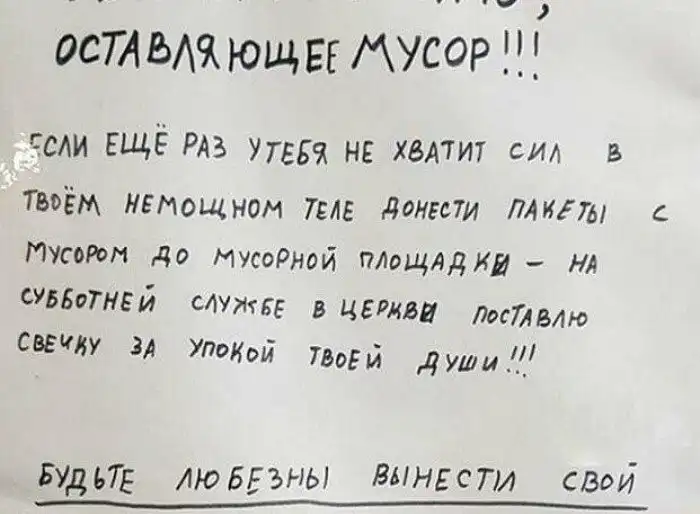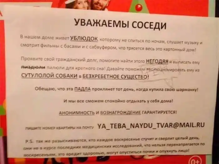 Соседи, доведенные до отчаяния, страшная сила - они могу устроить устроить настоящий террор, но как вежливые люди, сначала напишут предупреждение...