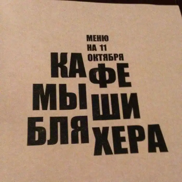 Думаете, сделать вывеску или надпись — это так просто? Как бы не так! Иногда буквы на них расположены в настолько странном порядке, что прочитать их правильно просто невозможно. От этого вывески обретают совершенно новые и комичные смыслы, а люди не упускают возможности сфотографировать их и поделиться в интернете. Смотрите!