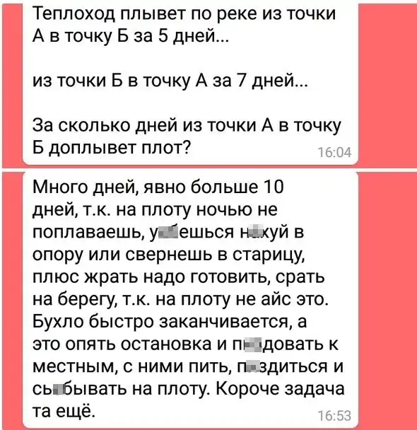 Вроде бы за 36 дней доплывет. Скорость течения 1 день добавляет. (разница в ходе 2 дня, вниз по течению -1 день, вверх +1 день) Без течения шел бы 6 дней. А так как скорость течения в 6 раз медленнее, то и времени понадобится в 6 раз больше. 36 дней. (не учитывая время на остановки, пьянки, гулянки итд... )