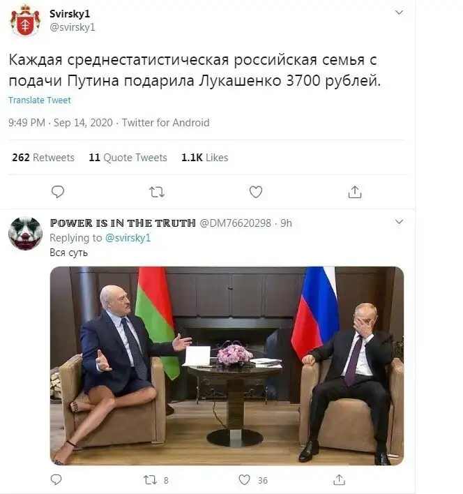 Первый раз после начала протестов в Беларуси президент России встретился с Александром Лукашенко. Переговоры за закрытыми дверями шли более четырех часов. Их итоги многих ввергли в шок. Реакция общественности в соцсетях не заставила себя долго ждать.