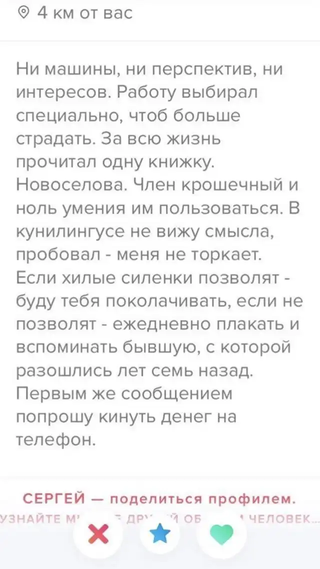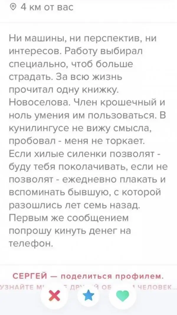 Говорят ведь, что любовь слепа, зла... и что там еще? Иногда набредешь на такую вот анкету в Сети и подумаешь: какой ужас. Хотя, в какой-то момент становится интересно. И вот вы уже муж и жена, имеете машину в кредит, ипотеку и другие блага цивилизации.