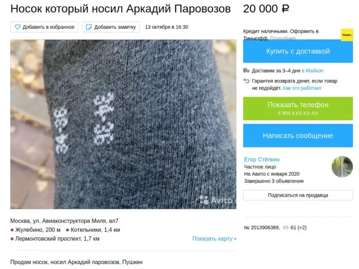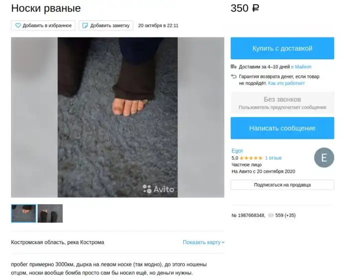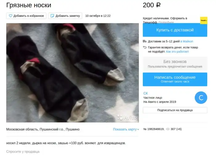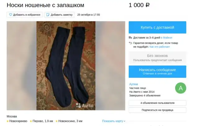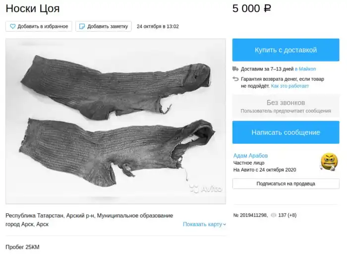 Мать честная, что только не продают люди! Вонючие и рваные, носки Цоя и Аркадия Паровозова! Вонючие носочки от милых дам... Только не спрашивайте, каким лешим меня занесло в такие дебри Авито ;)