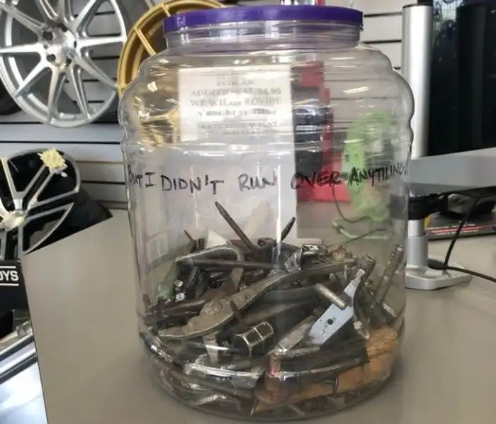 «В местном шинном магазине есть банка, полная различных вещей, которые работники нашли внутри лопнувших шин»