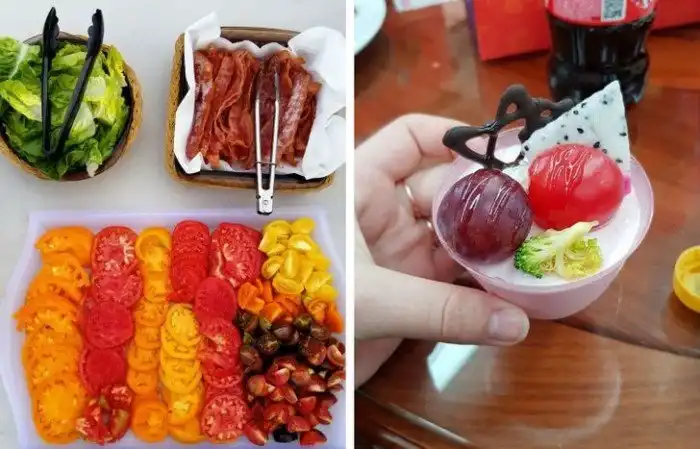 «Помидор — это фрукт в Китае, поэтому его можно встретить в десертах, на тортах и продается он всегда в отделах с фруктами. У нас в столовой можно было купить нарезанный помидор, посыпанный сахаром»