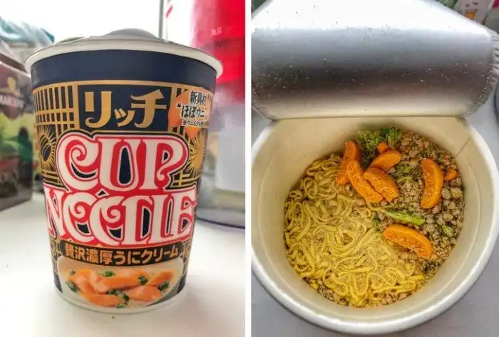 «Cерия лапши Cup Noodle Rich с икрой морского ежа. Она выглядит очень круто. Надписи переливаются золотым цветом на свету. Вкус специфический: лапша сладковатая»