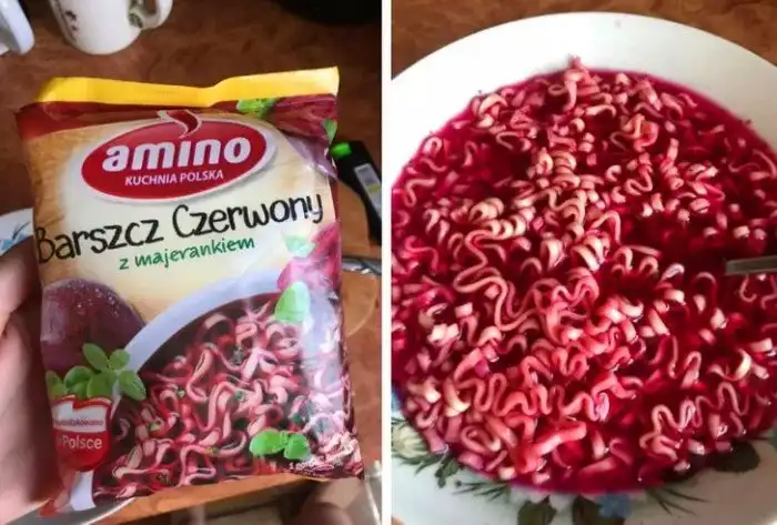 «Растворимая лапша со вкусом борща, купленная в Польше. С домашним борщом вкус не сравнится. Это скорее свекольный суп без мяса и навара, но все же довольно аппетитный и немного пряный»