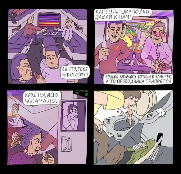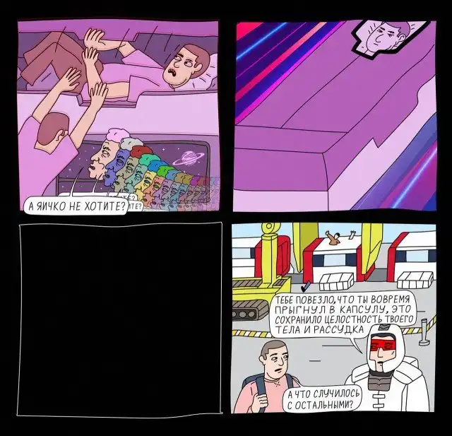 Российский киберпанк, не хватает еще бабки которая зайцем на садовой залезла, с рюкзаком яблок и двумя сумками картошки, ходит и просит приютить ее в капсуле потому что "хуле вы худые, подвинитесь, а у меня пенсия маленькая"