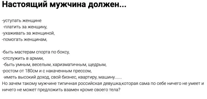 "Мужчина должен!" - фраза, которую в своей жизни слышал, наверное, каждый парень. По мнению большинства женщин с форумов мужчина должен обеспечивать, помогать по хозяйству, заботиться, любить, слушать, принимать участие в воспитании детей... Список можно продолжать бесконечно. Так кому и что в итоге ДОЛЖЕН или НЕ ДОЛЖЕН настоящий мужчина? Давайте разбираться!