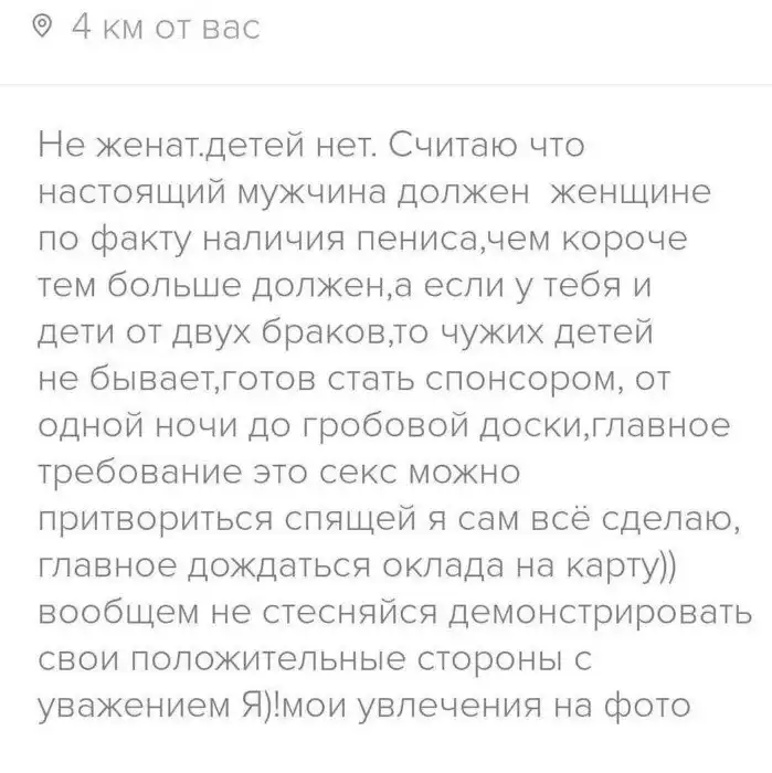 14. В приложениях для знакомств мужчины часто прикалываются над женщинами, которые считают, что им ВСЕ должны