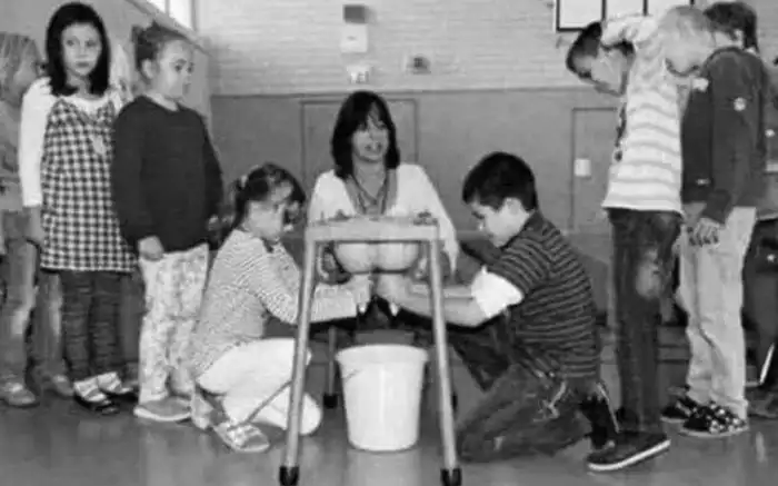 Дети учатся доить корову
