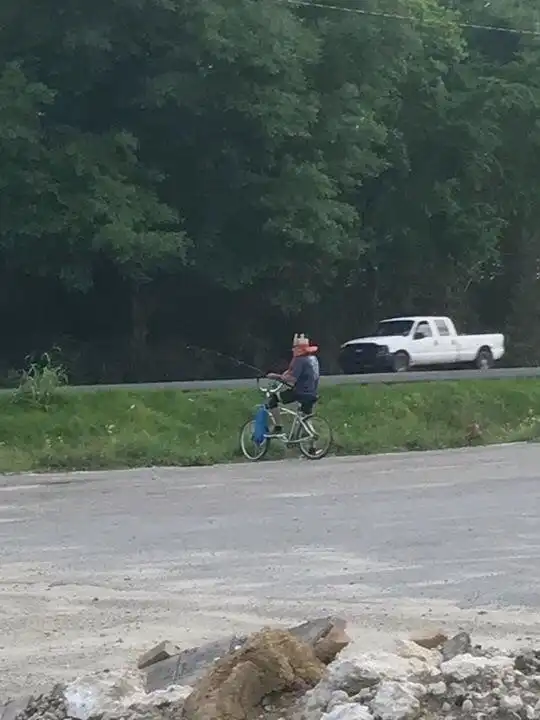 Этот человек ловит рыбу в придорожной канаве, в спасательном жилете и короне из Бургер Кинга