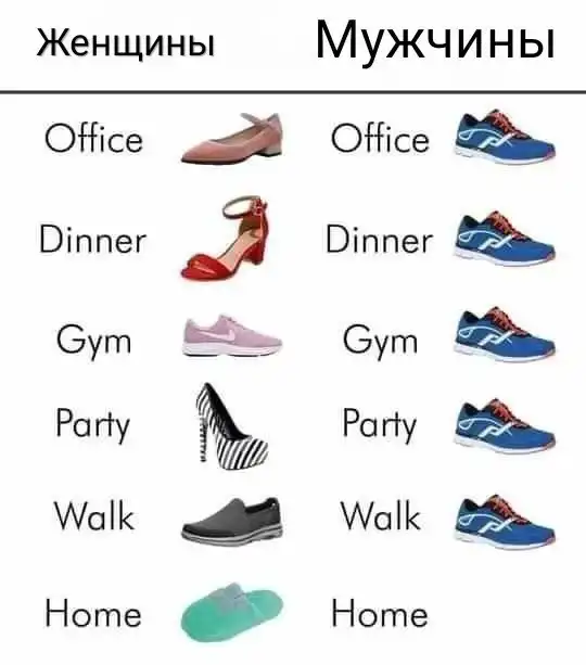 Обувь: офис, обед, спортзал, вечеринка, прогулка, дом