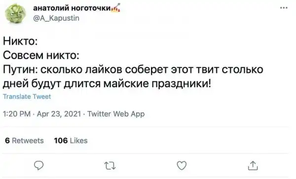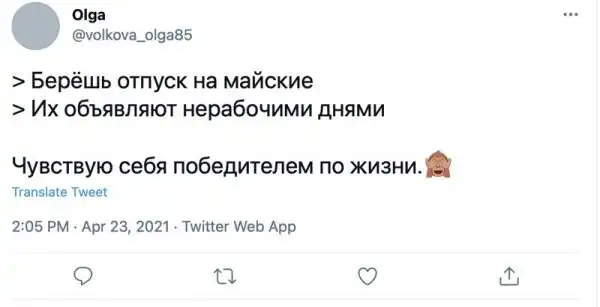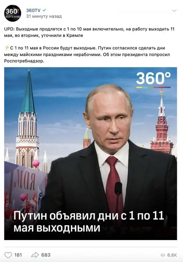 В этом году майские выходные должны были продлиться с 1 по 3 мая и с 8 по 10 мая. Согласно решению президента, теперь нерабочими станут и четыре дня между ними. Естественно, пользователи соцсетей не смогли пройти мимо этой новости, высказав свое мнение. P.S. Все неоднозначно!