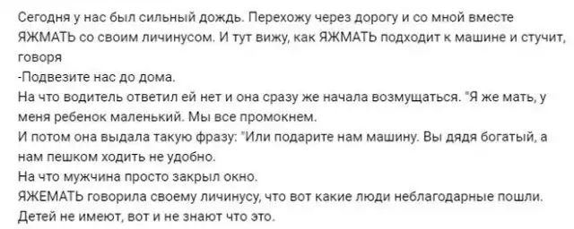 "Яжематери" - дамочки, заявляющие, что все вокруг чем-то им обязаны по одной простой причине - они смогли родить. Правда требования бесплатных товаров и услуг, различных скидок и прочего лишь вызывают смех у пользователей социальных сетей. Поэтому таким женщинам посвящают мемы, не забывая про детей и про сложные семейные отношения.