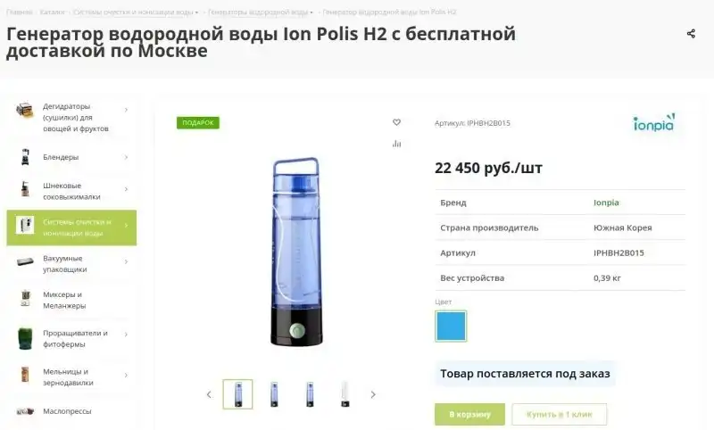 Подобные водородные очистители работают либо на токе, либо на встраиваемых баллончиках с водородом (крайне редко). Разработчики технологии водородной воды утверждают, что такая вода омолаживает, предупреждает развитие рака и вообще благотворно влияет на организм. Пить "электролизную воду" советуют корейские специалисты с 2007 года. Никаких научных исследований не проводилось и доказанной пользы от "водородно-кислородной" воды нет. Но если разбираться, то называть такую воду водородной - это лукавство. По факту получается водородно-кислородная вода. Но продавать её проблематично, поскольку попахивает маразмом. Поэтому назвали просто водородной.