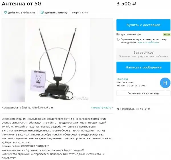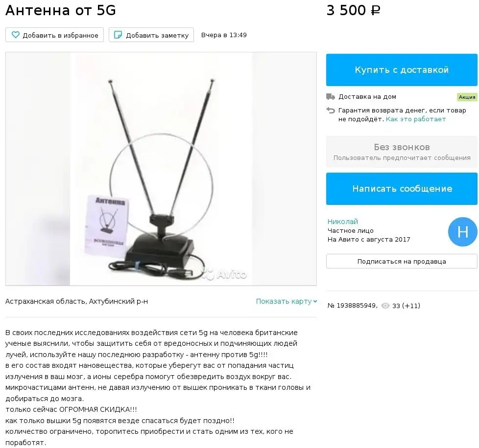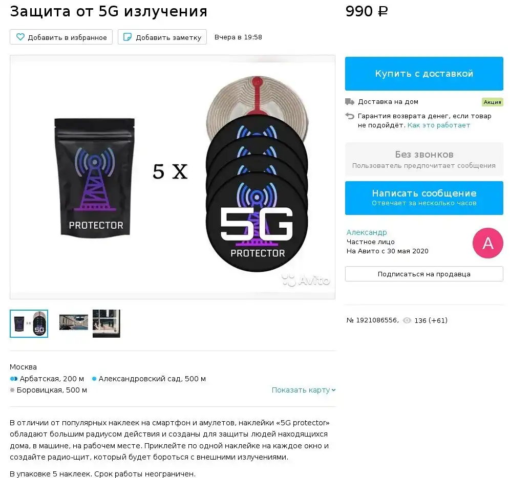 Подобные анти-5G крема и прочие товары активно продавались на Авито и Юле вплоть до начала 2021 года, пока площадки не поменяли свою политику по отношению к подобным вещам. Сейчас очень сложно найти даже шуточные объявления с шапочками из фольги, которые якобы защищают от "вредного" излучения. Но ещё недавно это была целая сфера бизнеса и большим финансовым оборотом.