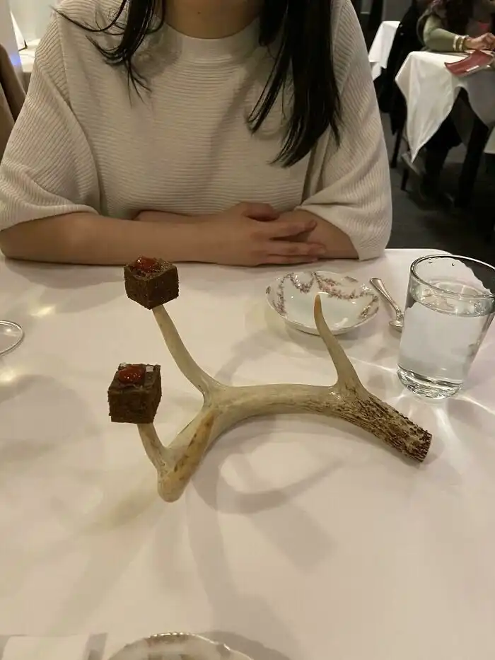 Десерт в виде навоза на вилах. Говорят, это шоколадный трюфель. Не знаем, пробовать не рискнули