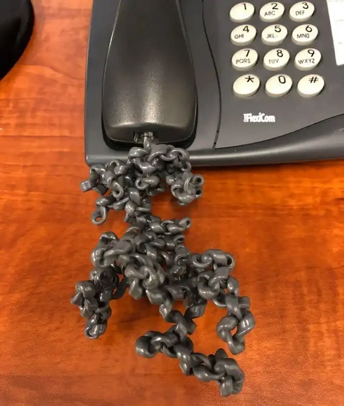13. "Пришлось использовать кабинет моего коллеги сегодня (он в отпуске), чтобы сделать несколько звонков. Телефонный шнур меня поразил"