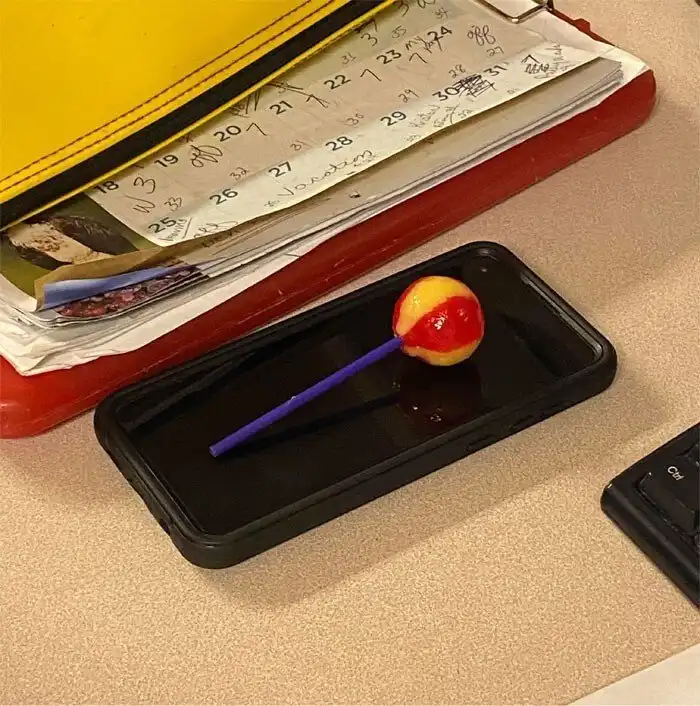 18. "Моя коллега по больнице кладет леденец на экран телефона"