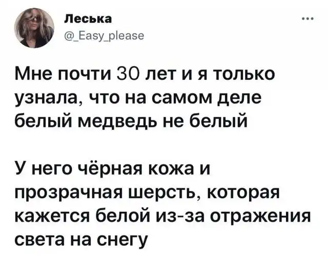 Это каким же *бланом нужно быть чтоб верить в прозрачную шерсть медведя? Яхуею, дорогой интернет, в зоопарке белый медведь, видимо, будет зеленым на фоне стены? Ой, бляяя...