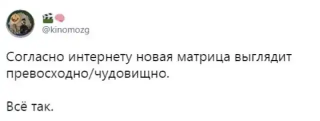 Мы уже видели небольшие фрагменты новой "Матрицы 4", которую называют "Матрица: Воскрешение". Кадры и видео смотрятся красиво, но вот что там внутри пока никто не знает. И истинные поклонники боятся, что сестры Вачовски (раньше ведь они были братьями) испортят оригинальную трилогию. И шутят о ней в Сети.