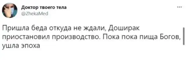 Первые новости о том, что любимая лапша быстрого приготовления "Доширак" перестала появляться на полках магазинов появилась в конце сентября. Никто не верил, но затем новости множились: "Доширак" отсутствовал в Рязани, Красноярске и других магазинах России. Стало известно, что производство остановили, поэтому ожидаются перебои с поставками. Пользователи испугались и стали шутить на эту тему.