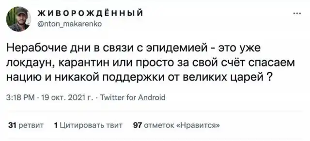Как известно, ранее Татьяна Голикова предложила сделать нерабочими дни с 30 октября по 7 ноября. Все, как сообщается, из-за распространения коронавируса. Конечно, все понимают, что это бесполезные полумеры, поскольку вряд ли кто-то действительно будет сидеть дома. Кроме того, далеко не каждый россиянин может позволить себе работать из дома. Поэтому реакция на такую новость соответствующая.