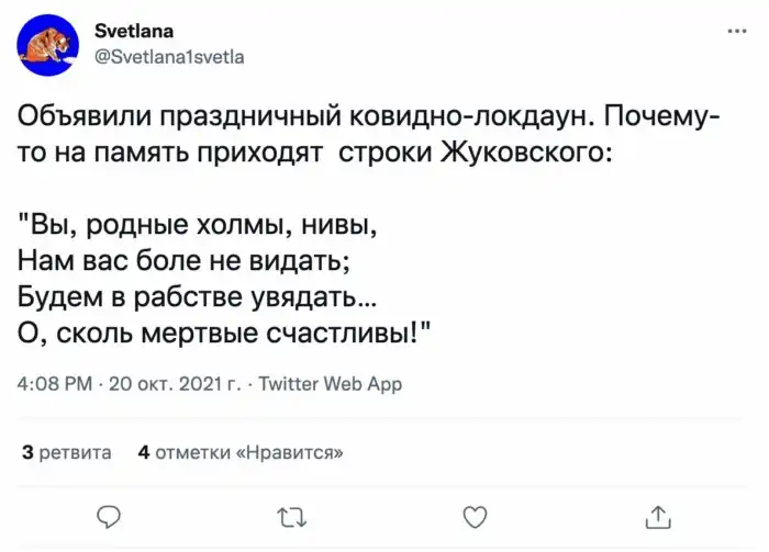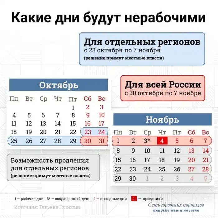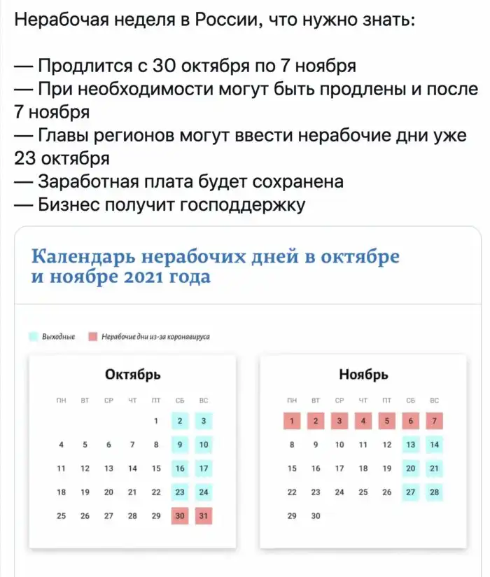 Владимир Путин согласился с предложением Татьяны Голиковой о нерабочих днях, поэтому дни с 30 октября по 7 ноября 2021 в России будут выходными (с сохранением зарплаты). Пользователи соцсетей (в привычной для них манере) отреагировали на данное решение.