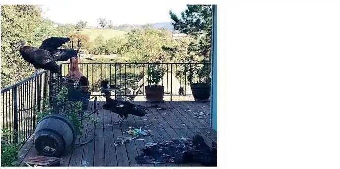 В Калифорнии живет несколько сотен диких кондоров. Двадцать ихз них объединились в стаю и регулярно громят веранду этого дома