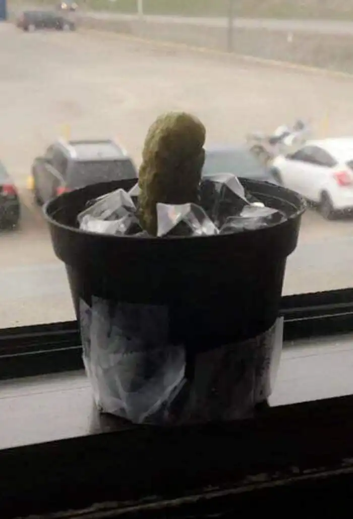 "Наш коллега уже две недели уверен, что это кактус. На самом деле, это просто соленый огурец, который мы втайне от него заменяем новым каждые два дня"