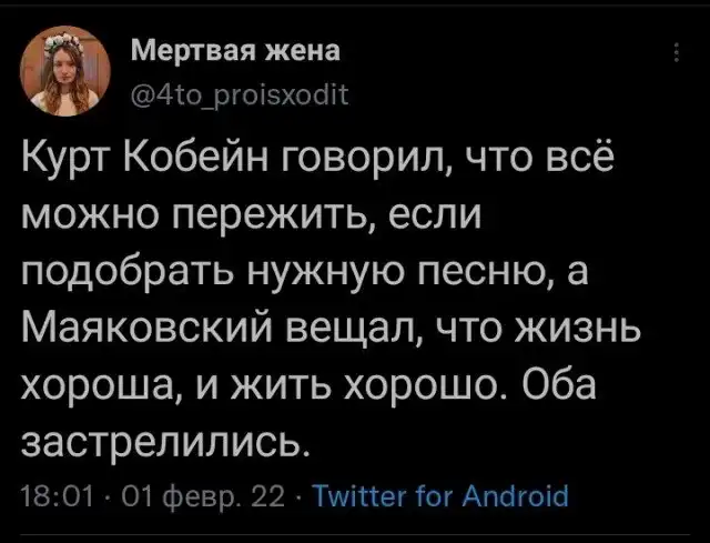 Про Кобейна и Маяковского скудоумный копипаст 100 постов подряд. Первый так и не подобрал нужную песню, а второй видимо херово жил, раз выпилился.