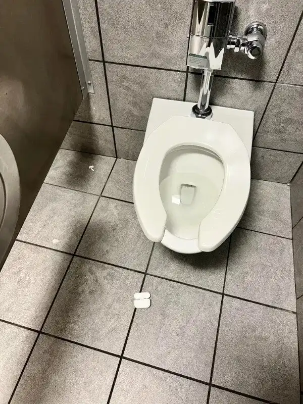 "Выронил AirPod Pro из кармана в туалете. Коробка упала на пол, но от удара открылась, и левый наушник отскочил прямо в унитаз, где сработавший датчик движения мгновенно унес его в канализацию. Вот это везение!"