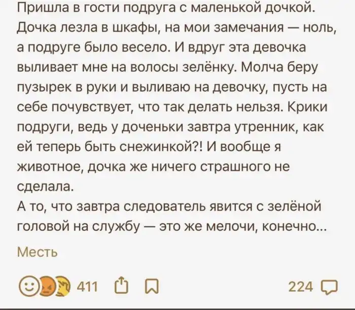 Marcy G: Когда моя четырехлетняя дочь злится на кого-то из нашей семьи, она делает рисунок семьи без обидчика. Никогда не видела подобной мелочной мстительности.