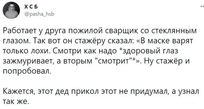 Настоящего сварщика найти очень просто — его выдают детали. Обычно такие люди ходят в железной обуви, имеют железный рюкзак... и они отменные акробаты.