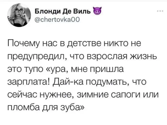 Очередной пост смешного "нытья" взрослых людей. Кто бы мог подумать, что взрослая жизнь — это жизнь от зарплаты до зарплаты. Лучшим же развлечением является глубокий и продолжительный сон.