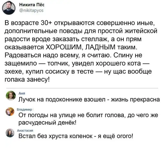 Чем старше становишься, тем больше понимаешь философию хоббитов из "Властелина колец". И всё больше понимаешь, что 30 лет – это только начало... начало конца.