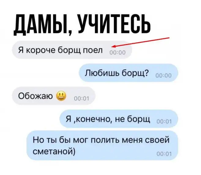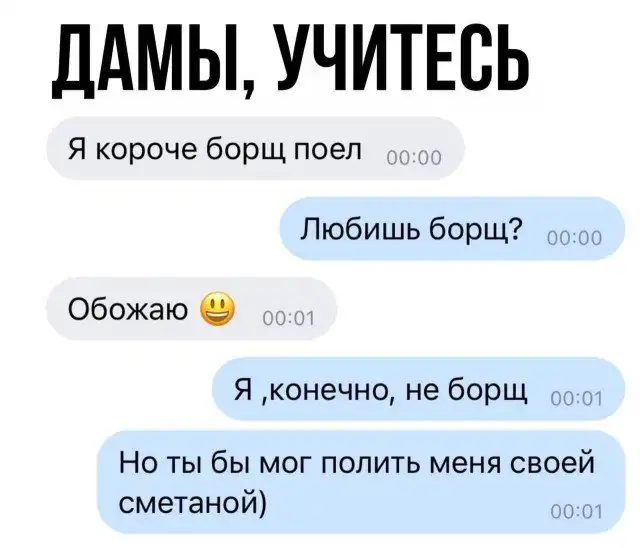 А что здесь п*дарского? Мужик написал бабе, что поел борща. А та ему предлагает кончить на неё. Только п*дары и видят во всем п*дарское