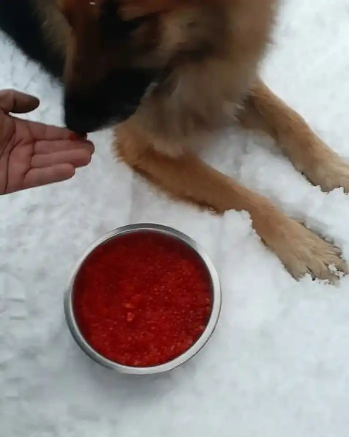 Собаку во дворе кормят