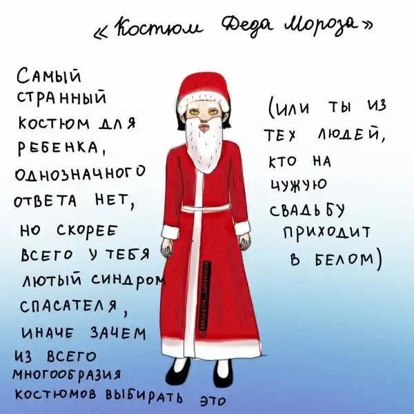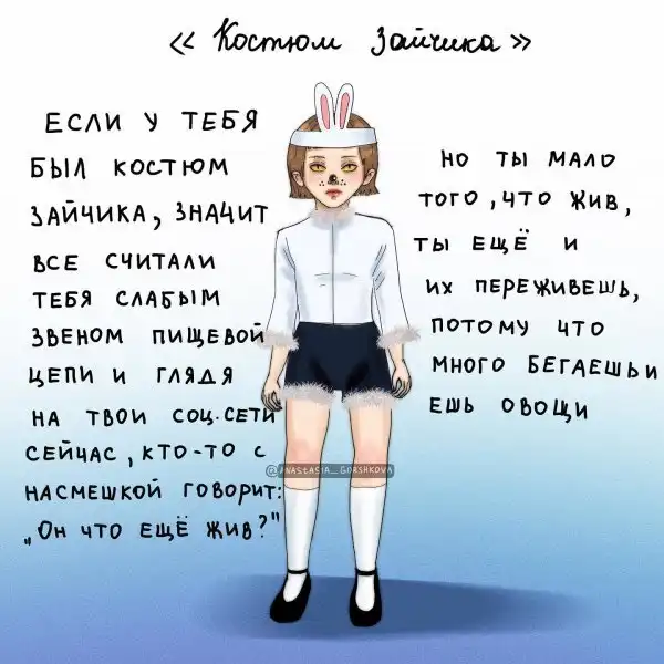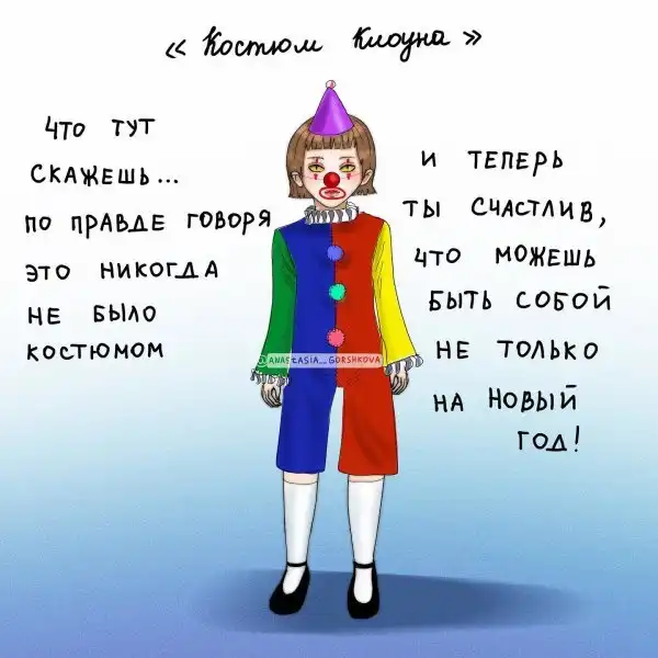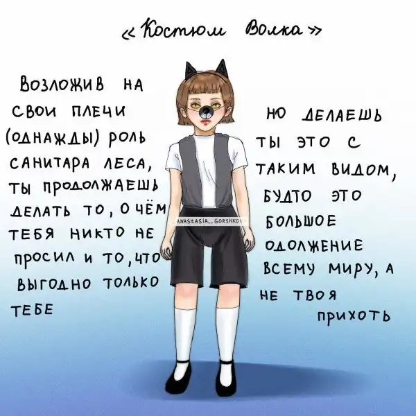 Художница Анастасия Горшкова решила вспомнить детство и вернуться во времена детского садика, а если точнее - новогодних утренников. И оказывается во всех этих костюмах "снежинок", "царевичей", "зайчиков" и "волчков" есть скрытый смысл. Художница попыталась и по-взрослому (и с грустной иронией) объяснить, что же они означают.