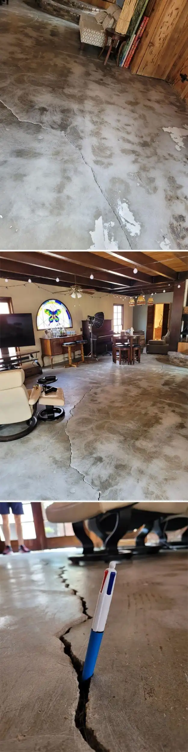 7. Этот дом затопило из-за прорыва трубы. Повреждение водой и дополнительное давление, которое она оказала на плиту, вызвали образование серьезной трещины в бетоне по всей длине гостиной